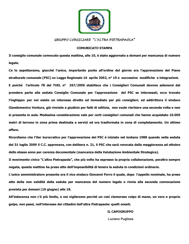 Cosa ne è stato della seduta del 15? Ecco la lettera di protesta del partito di opposizione, capitanato da Luciano Pugliese, in cui si denuncia l’assenza di consiglieri che potrebbero essere interessati dall’approvazione del piano. Secondo la legge, chi ha motivi di interesse personale non può votare un piano regolatore… Anche il sindaco ha pensato bene di non farsi vedere, dopo gli ultimi eventi riportati dai giornali locali.