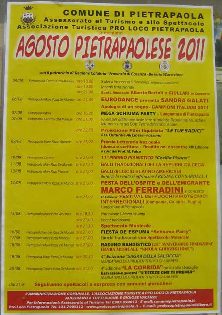 Eccovi il programma completo per agosto 2011. Oltre alla festa del patrono del paese san Domenico, di cui abbiamo parlato in un precedente articolo, ci sono da segnalare la festa dell’ospite il 14 agosto e le celebrazioni dedicate a santa Maria Assunta il 15. Nel primo caso, a intrattenere il pubblico sarà Marco Ferradini, mentre la serata si concluderà come ogni anno con i fuochi pirotecnici sul mare. A Ferragosto si potrà seguire la processione ei onore di santa Maria ‘Assunta alla Scalo di Pietrapaola, la sera è previsto uno spettacolo musicale su cui speriamo di potervi dare presto altre indicazioni.