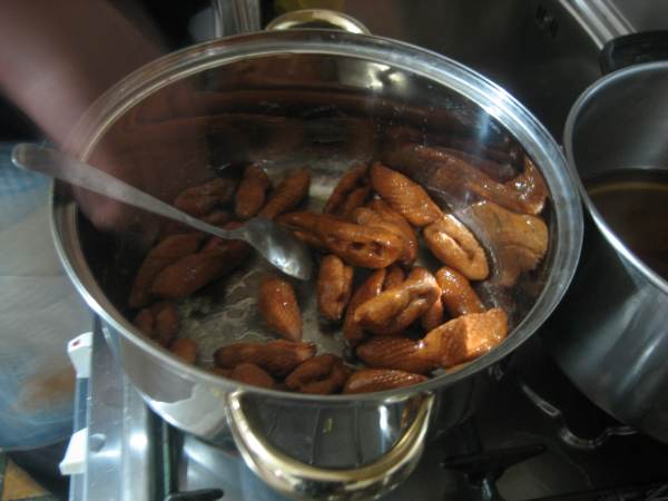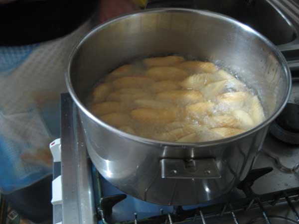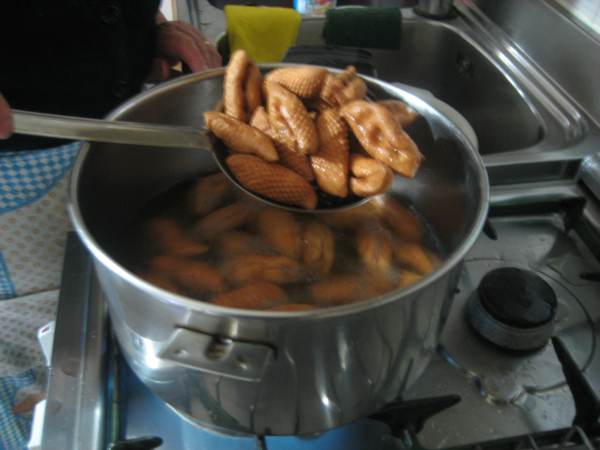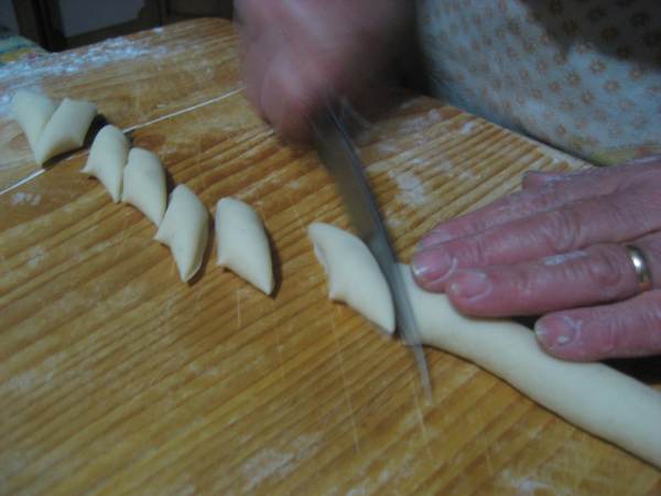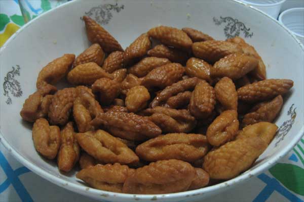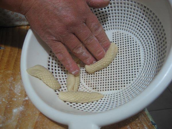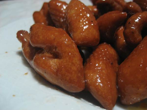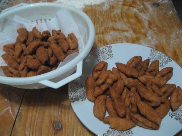Unire olio e acqua in una pentola e portare appena a bollore, quindi togliere dal fuoco. Mettere la farina a fontana su una spianatoia e versarvi l’acqua. Lavorare fino a che l’impasto non diventa fermo e consistente. Staccare dei pezzi, lavorarli un poco sulla spianatoia sfilandoli, quindi tagliare trasversalmente dei bastoncini a forma di tronchetti (simili a grossi gnocchi). Con l’apposito arnese, la crustulara, dare la forma caratteritica. In sostituzione, è possibile arrotolare i tronchetti sul dorso di uno scolapasta. Friggere in abbondante olio e togliere quando sono dorati. In un’altra pentola scaldare il miele e tuffarvi i crustuli. Posare su un vassoio e servire. Spolverare con i chiodi di garofano.