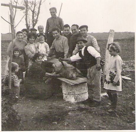Da destra: Rosetta Madera (la bambina), Francesco Fullone (zzu Franciscu, con il coltello in mano); segue Benito Madera, Martino Cataldo; Pino Madera, Salvatore Madera, Caruso Domenico (Mighittu), Linda Madera, Amalia Fullone (con il bambino in braccio), Bice Albidone, Teresina Albidone (in ginocchio).