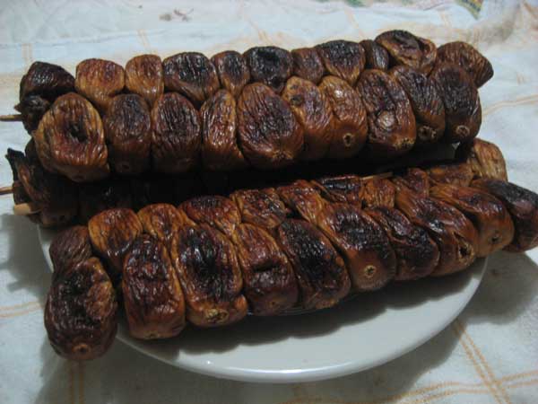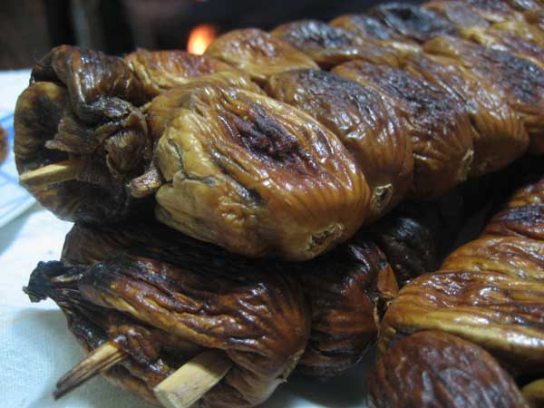 Quando i fichi sono dorati, estrarre le trecce e immergerle velocemente in una ciotola di acqua fresca, quindi asciugare altrettanto velocemente con un panno di cotone e avvolgerli in un altro, che servirà per la conservazione. (Questa operazione, se ben eseguita, permette ai fichi di restare morbidi per molti mesi). Mettere le trecce così avvolte in un contenitore di cartone e conservare alcuni mesi.