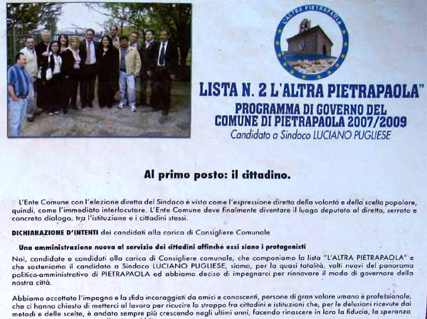 Le elezioni del 2007 si sono concluse con un risultato che ci ha convinti che la via era quella giusta: su 971 elettori, 445 (cioè il 45,8 per cento) hanno scelto L’Altra Pietrapaola.