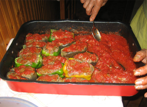 Preparare un sugo con i pomodori e gli altri ingredienti. Nel frattempo tagliare le melanzane in due e scavarle. I peperoni possono essere utilizzati in alternativa alle melanzane o insieme ad esse. Mettere una pentola sul fuoco e portare a bollore l’acqua con con un po’ di sale, quindi scottare le melanzane, prima la buccia, poi la parte interna (ha bisogno di più tempo per sbollentare). Scolare le melanzane – in particolare la polpa deve essere ben asciutta. Mettere in una terrina la polpa, il pane, il formaggio, il basilico, il pepe nero, l’aglio, un pizzico di sale ed eventualmente il peperoncino piccante. Amalgamare il tutto con l’uovo e aggiungere qualche cucchiaio del sugo di pomodoro precedentemente preparato, facendo un impasto tipo polpetta. Riempire le bucce di melanzana. Mettere sul fondo di una teglia parte del sugo di pomodoro, posizionare le melanzane ripiene e cospargerle con altro sugo. Infornare per 20-30 min a 170˚. Le melanzane sono pronte quando il sugo si è asciugato.